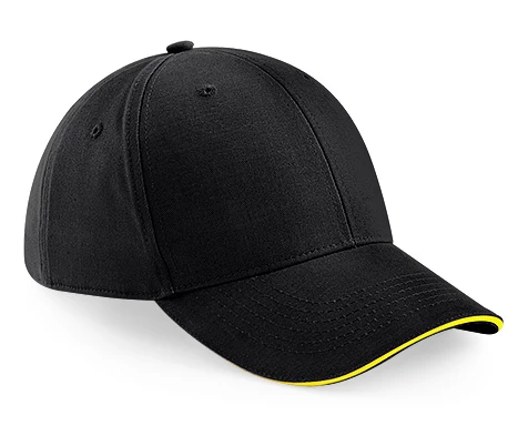 Štítek TearAway pro snadnou změnu značky, design 6 panelů, střední profil, předem zakřivený kšilt, kontrastní barevný sendvičový kšilt, strukturované přední panely, prošitá větrací očka, popruh z látky s tříkluznou sponou