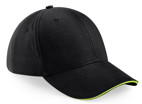 Štítek TearAway pro snadnou změnu značky, design 6 panelů, střední profil, předem zakřivený kšilt, kontrastní barevný sendvičový kšilt, strukturované přední panely, prošitá větrací očka, popruh z látky s tříkluznou sponou