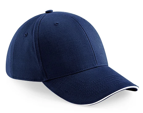 Štítek TearAway pro snadnou změnu značky, design 6 panelů, střední profil, předem zakřivený kšilt, kontrastní barevný sendvičový kšilt, strukturované přední panely, prošitá větrací očka, popruh z látky s tříkluznou sponou