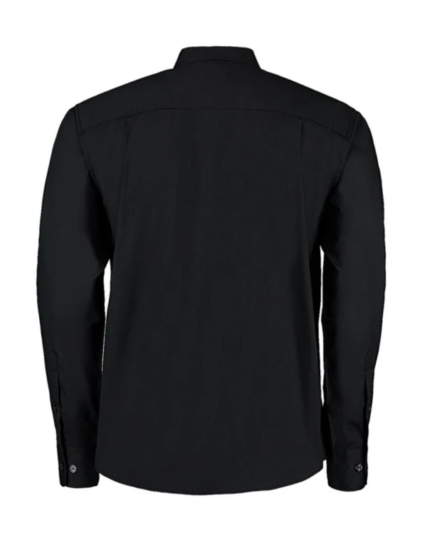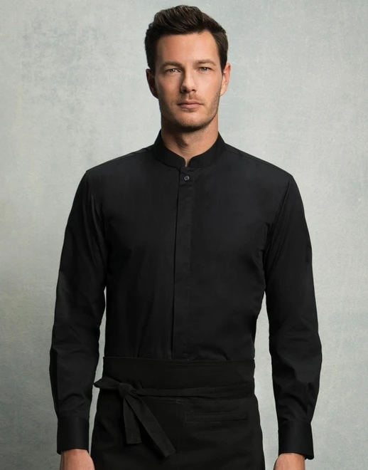 Košile v asijském stylu s dlouhým rukávem, snadné udržovaní, malý stojáček, sedlo na zadním dílu s dvěma plisé, knoflíky v barvě košile zakryté légou (je vidět pouze první shora), nastavitelné manžety, zaoblený spodní lem.