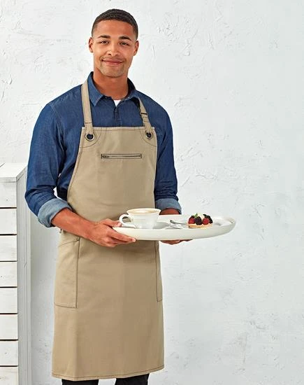 Ekologická zástěra s náprsenkou vyrobená z kombinace recyklovaného polyesteru a bavlny z odpovědných zdrojů. Se dvěma praktickými bočními kapsami s nýtovanými detaily. Středová kapsa na zip se táhne na spodní stranu a umožňuje aplikace výšivek. Kontrastní prvky prošívání na celé této zástěře a velká starožitná mosazná očka dodávají designu industriální styl.