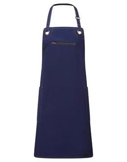 Ekologická zástěra s náprsenkou vyrobená z kombinace recyklovaného polyesteru a bavlny z odpovědných zdrojů. Se dvěma praktickými bočními kapsami s nýtovanými detaily. Středová kapsa na zip se táhne na spodní stranu a umožňuje aplikace výšivek. Kontrastní prvky prošívání na celé této zástěře a velká starožitná mosazná očka dodávají designu industriální styl.