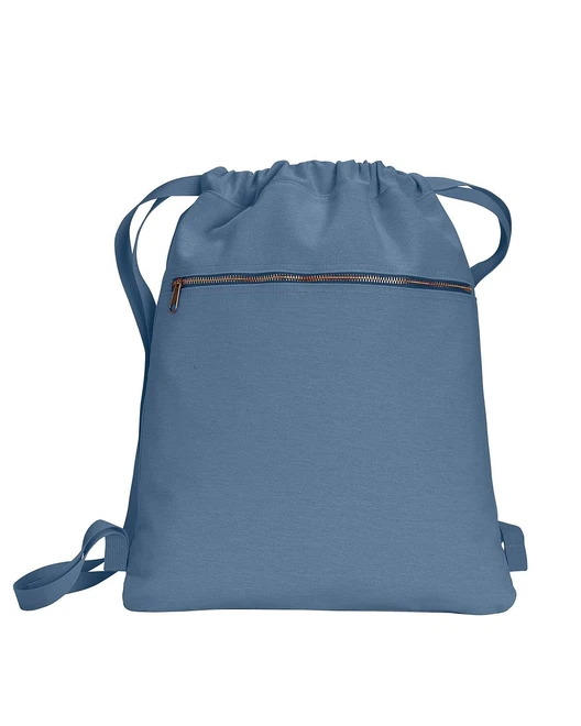 Tkané ramenní popruhy, hlavní kapsa na stahovací plochou šňůrku, přední kapsa s mosazným zipem.