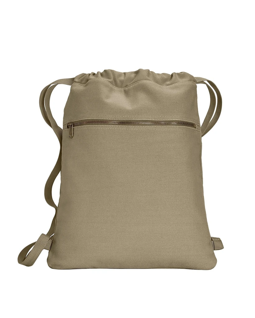 Tkané ramenní popruhy, hlavní kapsa na stahovací plochou šňůrku, přední kapsa s mosazným zipem.