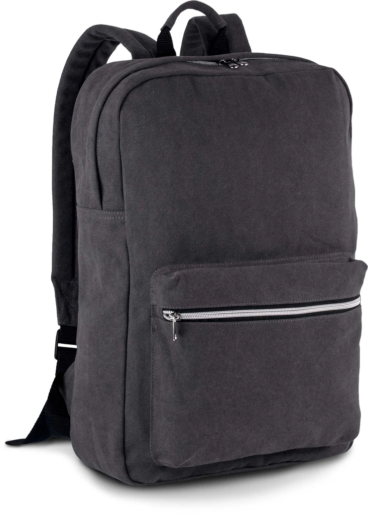 Materiál: bavlněné plátno (450 g/m2); Vnitřní polstrovaná přihrádka na tablet nebo notebook do velikosti 13", kovový zip v kontrastní barvě, přední kapsa na zip, vyztužené ramenní popruhy, polstrovaná záda. Rozměry: 43 x 30 x 12 cm