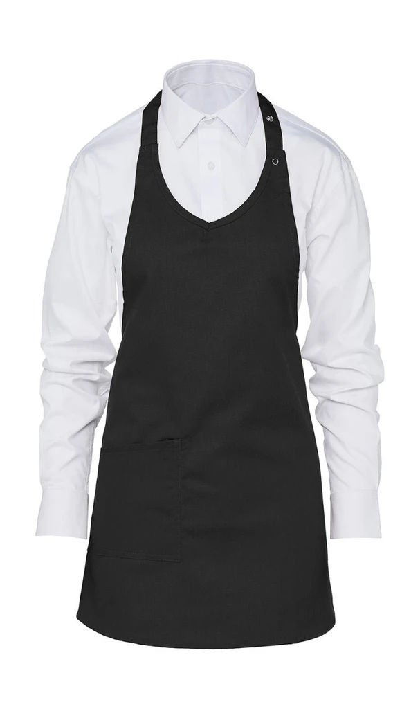 Tato pohodlná krátká zástěra s náprsenkou s výstřihem do V a nastavitelným nákrčníkem na druky je chytrá a funkční díky našité kapse, snadno udržovatelné polybavlněné tkanině a skvělé možnosti praní – 60° pro všechny barvy. Je to praktická a odolná volba.
