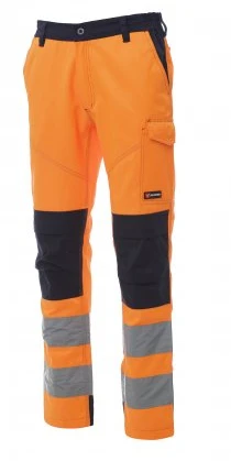 Pánské kalhoty s chrániči kolen, vhodné pro celoroční nošení, dvoubarevné provedení s reflexními pruhy, vysoká viditelnost, elastické pásky na bocích a poutka v pase, zapínání na plastový zip a na knoflík, dvě přední kapsy klasického střihu, jedna postranní kapsa LOCK SYSTEM, jedna kapsa na svinovací metr, kapsa na smartphone, dvě zadní kapsy, z nichž jedna otevřená a s reflexními páskami a druhá s klopou na suchý zip. Kontrastní švy, trojité prošití v rozkroku a na vnitřní straně nohavic