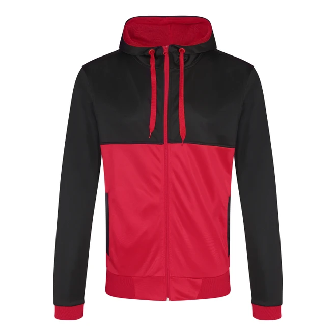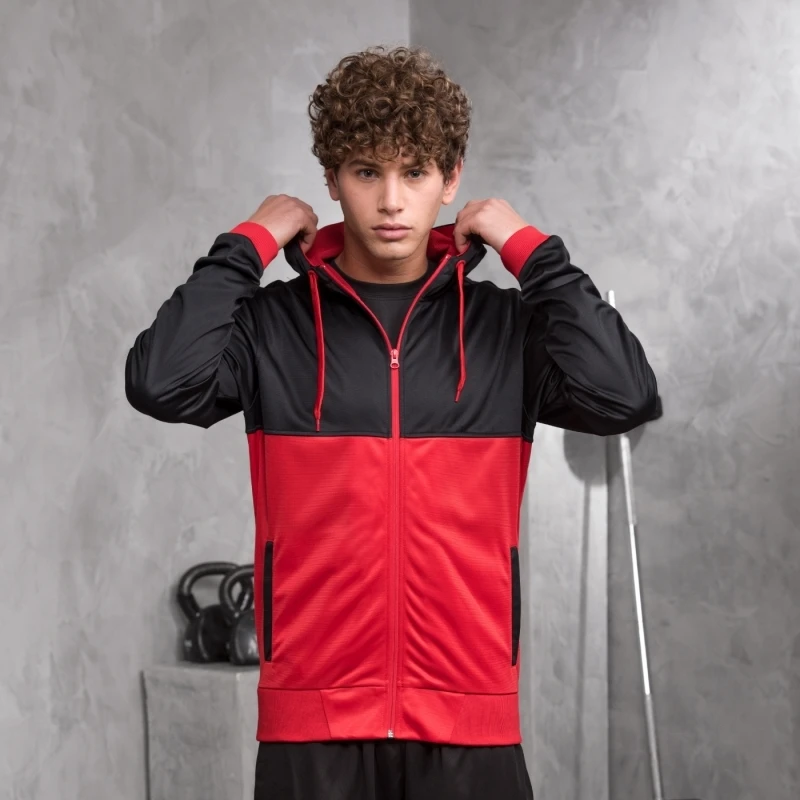 Mnoho barevně kontrastních vsadek, sportovní pohodlný střih, velký prostor pro potisk (vpředu i vzadu), podšívka kapuce ze síťoviny, vsazené rukávy, žebrované manžety a spodní lem, zip po celé délce, přední kapsy, snadná změna značky.
