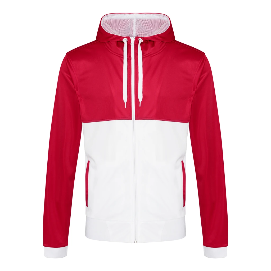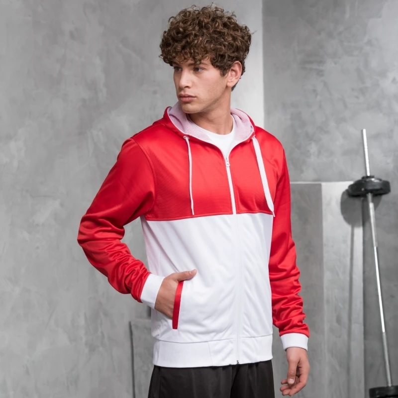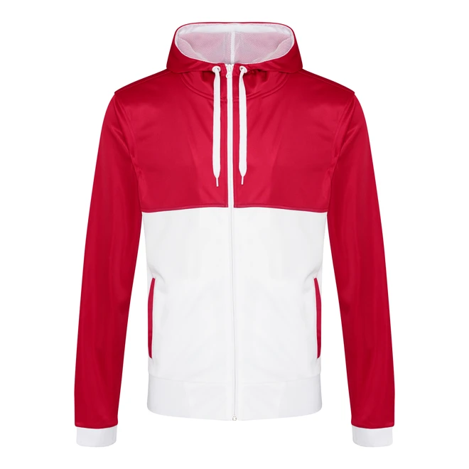 Mnoho barevně kontrastních vsadek, sportovní pohodlný střih, velký prostor pro potisk (vpředu i vzadu), podšívka kapuce ze síťoviny, vsazené rukávy, žebrované manžety a spodní lem, zip po celé délce, přední kapsy, snadná změna značky.