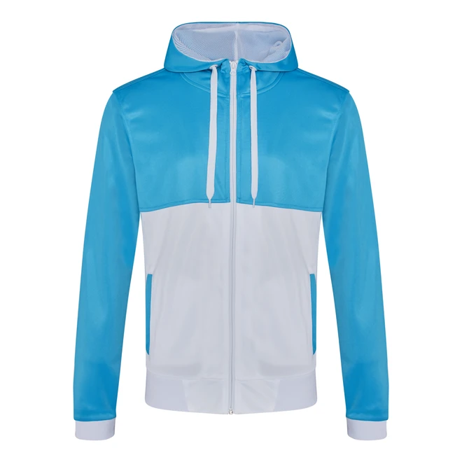 Mnoho barevně kontrastních vsadek, sportovní pohodlný střih, velký prostor pro potisk (vpředu i vzadu), podšívka kapuce ze síťoviny, vsazené rukávy, žebrované manžety a spodní lem, zip po celé délce, přední kapsy, snadná změna značky.