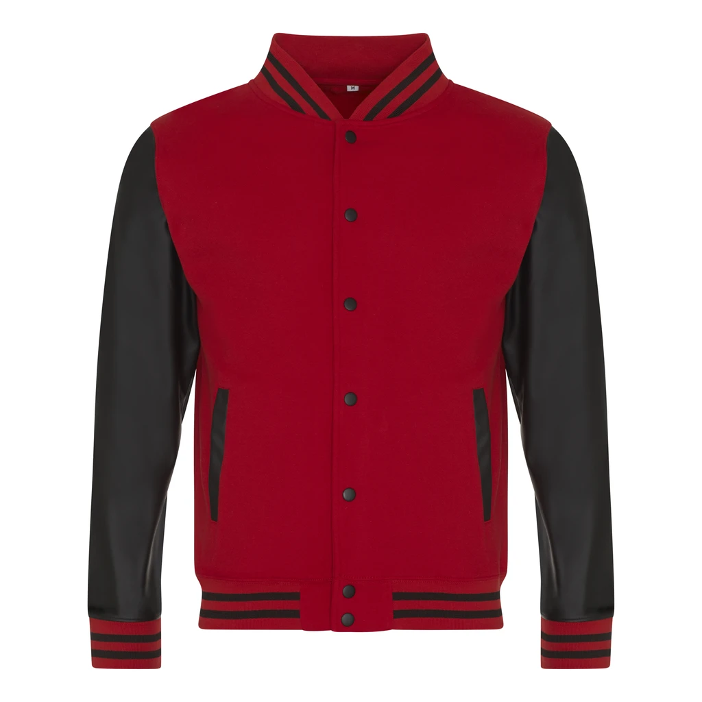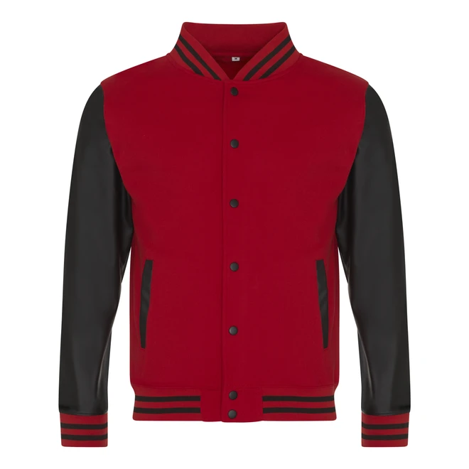 Pletený límec, manžety a spodní lem - pruhovaný detail, rukávy z umělé kůže, zapínání na cvočky, lemované kapsy umělou kůží, poutko na zavěšení, jednoduchá změna značky, ideální povrch pro potisk, unisex.