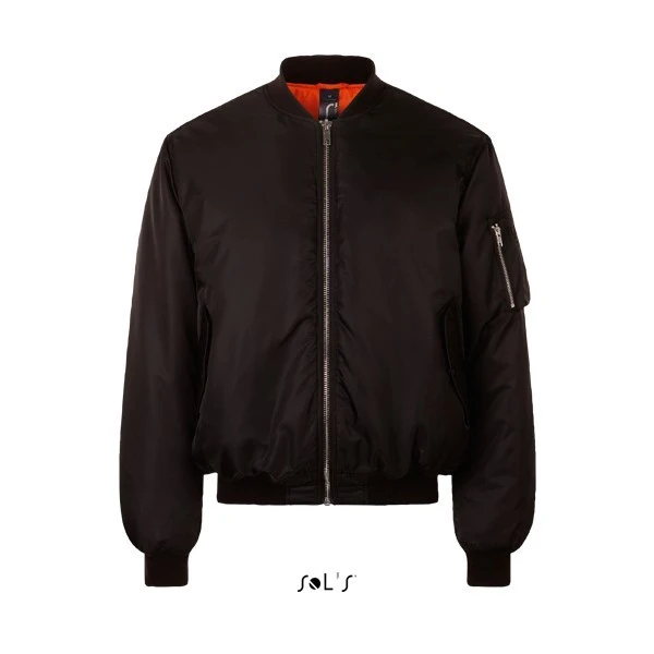 Zapínání na zip, žebrování kolem límce, manžet a spodní části, 2 kapsy s klopou na cvoček, 1 kapsa na zip na rukávu, kontrastní oranžová podšívka