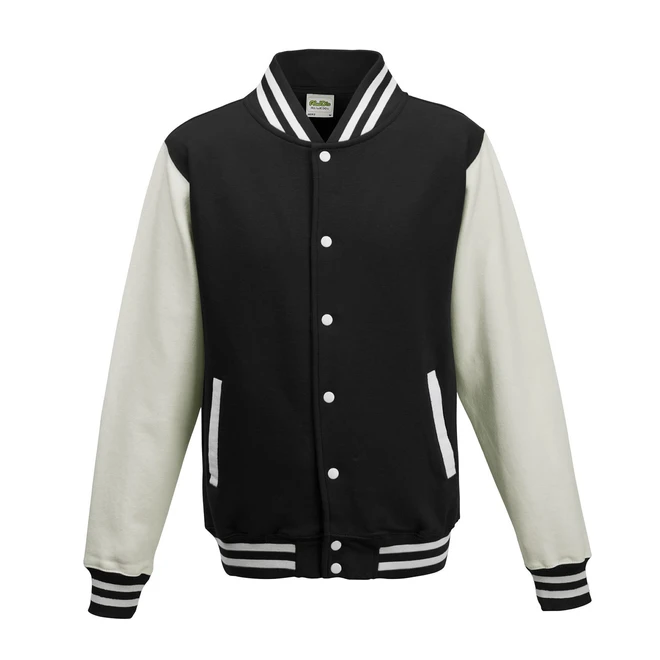 Pletený límec, manžety a dolní lem - pruhovaný detail, kontrastní rukávy, zapínání na cvočky v kontrastní barvě, dvě boční kapsy s vývodem na sluchátka, výztužná páska za krkem, jednoduchá změna značky, ideální povrch pro potisk.