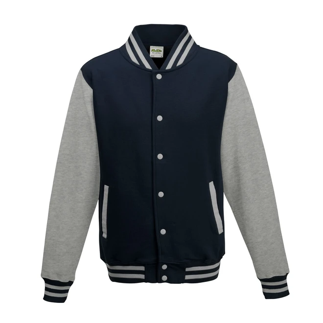Pletený límec, manžety a dolní lem - pruhovaný detail, kontrastní rukávy, zapínání na cvočky v kontrastní barvě, dvě boční kapsy s vývodem na sluchátka, výztužná páska za krkem, jednoduchá změna značky, ideální povrch pro potisk.