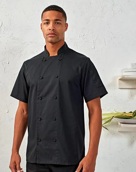 Kuchařský rondon s krátkým rukávem vyrobený z naší vlastní tkaniny Coolchecker®. Středový zadní panel je vyroben z tkaniny Coolchecker®, která nabízí výjimečné vlastnosti odvádění vlhkosti a odvodu vlhkosti, takže kuchař zůstane během služby svěží a chladný. Zavinovací zapínání na deset knoflíků z vlastní tkaniny s mandarinkovým límečkem a užitečnou dvojitou kapsou na pero na levé paži.