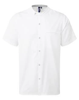 Tato moderní kuchařská košile s nízkým límečkem kombinuje odolnost kuchařského rondonu s lehkostí košile. Asymetrický mandarinský límec s cvoky po celé délce pro snadné oblékání. Kontrastní vnitřní lem kolem krku pomáhá skrýt potní skvrny z každodenního nošení. Kapsičku lze posunout, aby umožnila výšivku. Vyrobeno z kombinace recyklovaného polyesteru a bavlny.