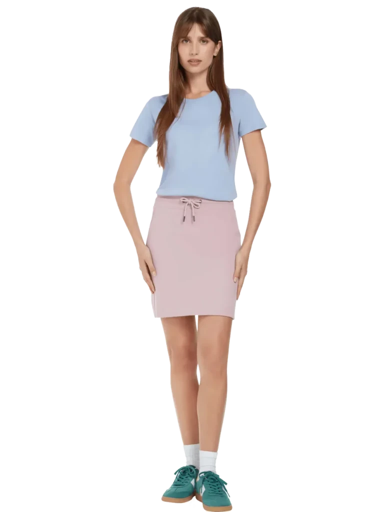 Sukně je navržena s žebrovaným elastickým pasem a stahovacími šňůrkami s kulatými koncovkami pro čistý, moderní vzhled. Má také jemný detail na bočním panelu, který zdůrazňuje tvar a zároveň zachovává minimalistickou estetiku.