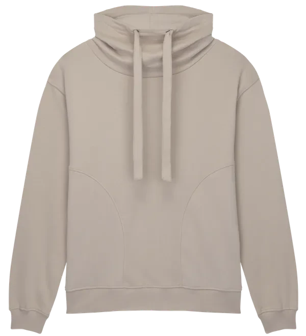 Je vyrobena z pevné organické bavlny o gramáži 300 g/m² a povrch látky je upraven tak, aby byl měkký a semišový, což zvyšuje pocit luxusu. Charakteristický rolák poskytuje větší teplo a zároveň zachovává strukturovaný, módní vzhled.