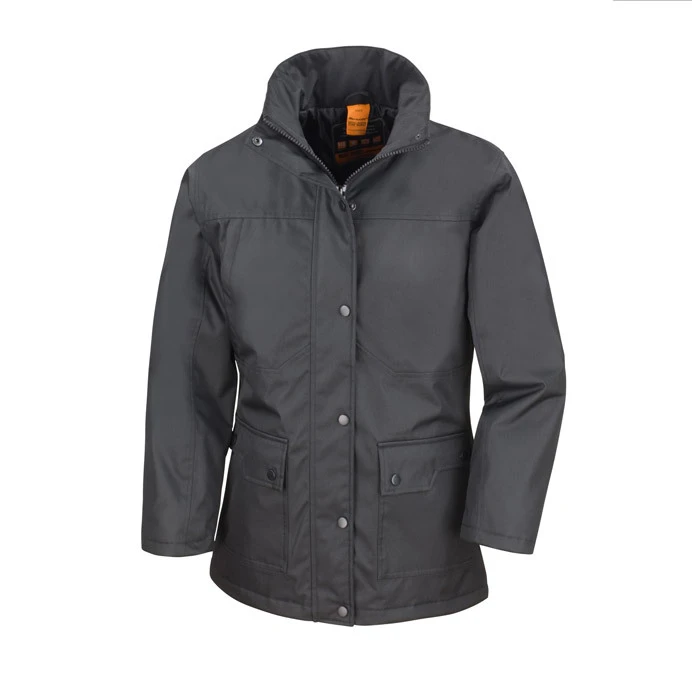 Skrytá odnímatelná kapuce na zip, dvoucestný zip s patentkami, síťovaná očka v podpaží, různé kapsy, střední žebrované manžety, nastavitelný spodní lem, vypasovaný střih, podlepené švy (vodotěsná do 2.000 mm), prodyšná do 2000 g/m², vhodná pro výšivku, přístup pro dekoraci dolním vnitřním zipem a levým vnitřním zipem na prsou.