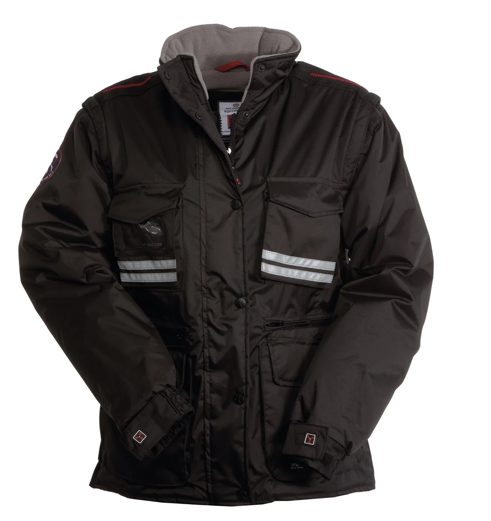 8 mm široký plastový zip po celé délce, kovový jezdec, klopa s cvoky po celé délce, odepínací rukávy, odepínací kapuce, nastavitelné manžety, reflexní proužky vpředu i vzadu, boční ventilační otvory na zip, 9 vnějších kapes - 2 se speciálním zavíracím systémem, 2 na zip a s vyztuženým vnitřkem, 1 kapsa průhledná, vatová vycpávka, podšívka na límci z microfleecu