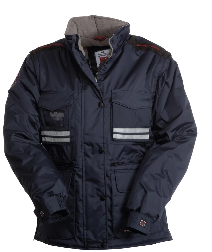 8 mm široký plastový zip po celé délce, kovový jezdec, klopa s cvoky po celé délce, odepínací rukávy, odepínací kapuce, nastavitelné manžety, reflexní proužky vpředu i vzadu, boční ventilační otvory na zip, 9 vnějších kapes - 2 se speciálním zavíracím systémem, 2 na zip a s vyztuženým vnitřkem, 1 kapsa průhledná, vatová vycpávka, podšívka na límci z microfleecu