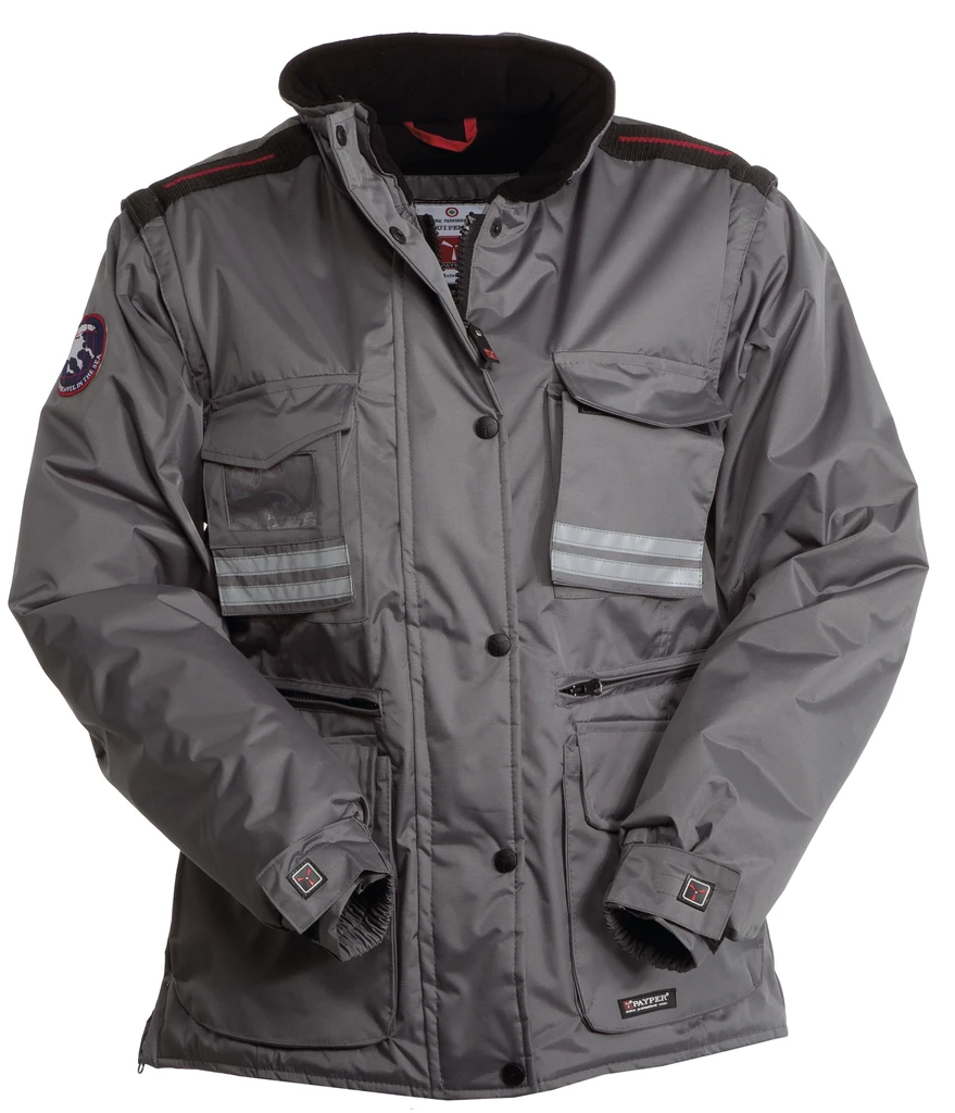 8 mm široký plastový zip po celé délce, kovový jezdec, klopa s cvoky po celé délce, odepínací rukávy, odepínací kapuce, nastavitelné manžety, reflexní proužky vpředu i vzadu, boční ventilační otvory na zip, 9 vnějších kapes - 2 se speciálním zavíracím systémem, 2 na zip a s vyztuženým vnitřkem, 1 kapsa průhledná, vatová vycpávka, podšívka na límci z microfleecu