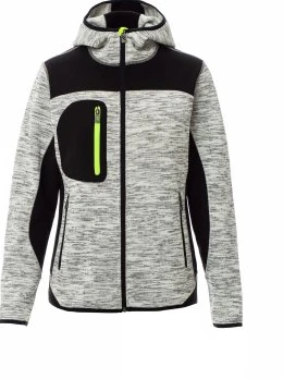 Zip po celé délce, kapuce s dvojitým prošitím, tenké manžety a spodní lem, 2 boční kapsy na zip, kapsa na prsou, úplet s vsadkami z černého softshellu