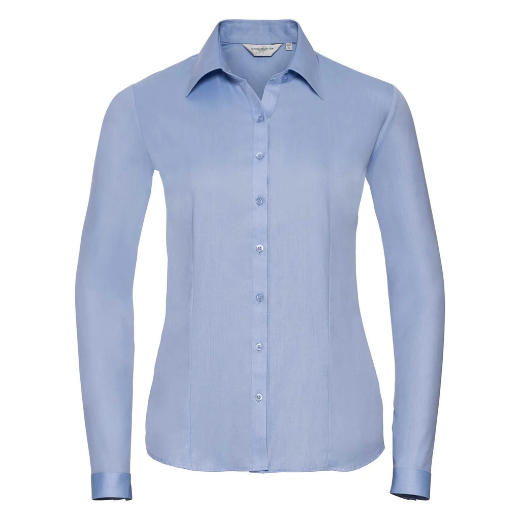 Gramáž: 130 g/m² (White: 125 g/m²); Materiál: 84% bavlna, 16% polyester; Dámská přiléhavá halenka ze směsového materiálu; Klasický materiál, elegantní, moderní límec, dlouhé rukávy, úzká léga, stylové úzké manžety, záševky vpředu a vzadu, vypasovaná, snadné ošetřování. Certifikáty: STANDARD 100 by OEKO-TEX®; WRAP