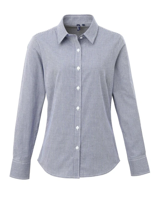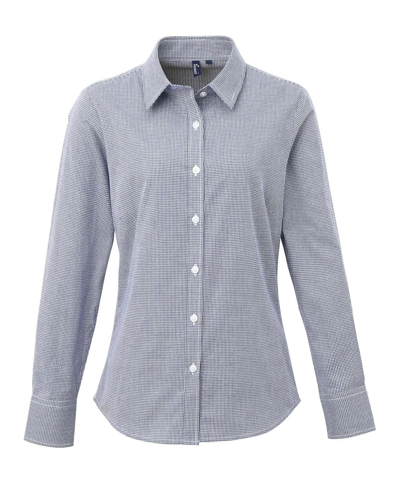Bavlněná příze z barveného popelínu, oblíbený vzor drobné kostky, záševky v oblasti hrudníku a zad, zahnutý lem, střih s měkkým límečkem, manžety s dvojitými knoflíky.