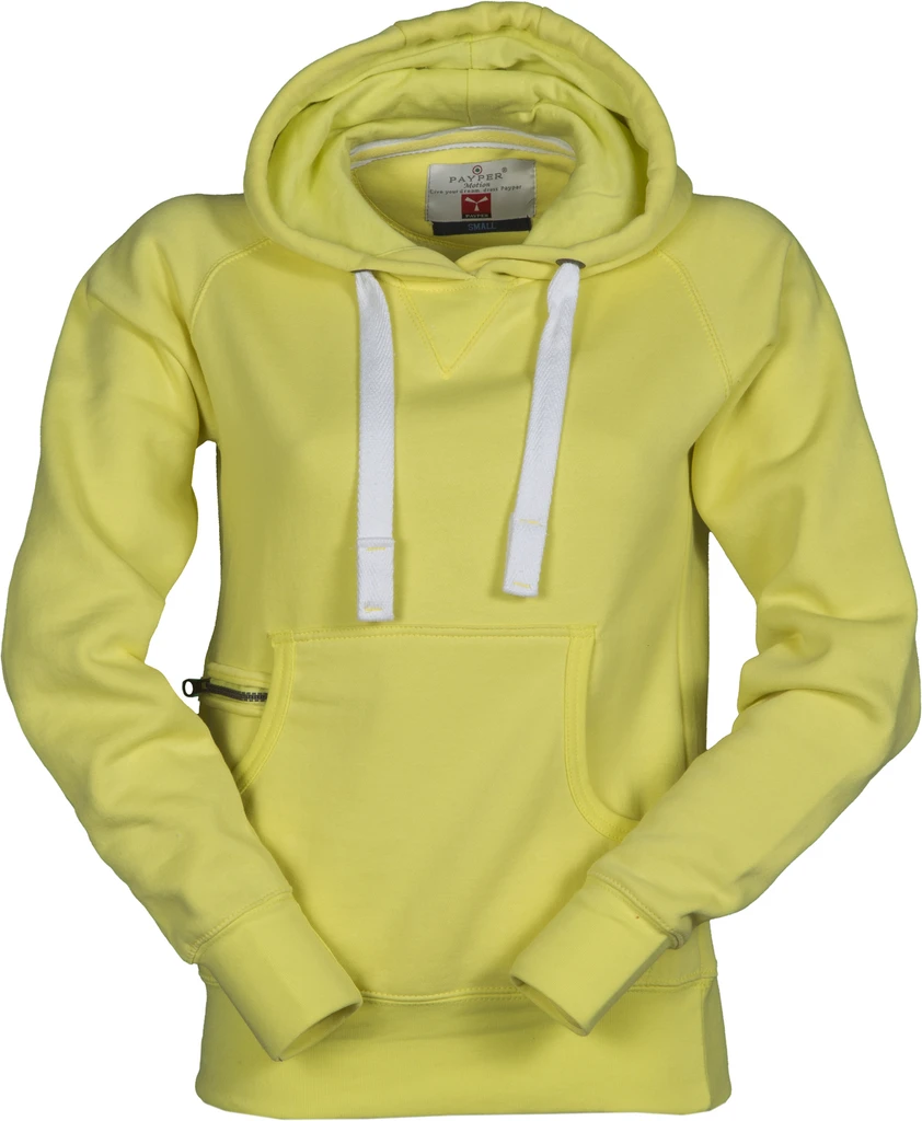 Dvojité švy, kapuce, kovová očka na kapuci, bílá stahovací šňůrka, raglánové rukávy, dekorativní prošití do "V" pod výstřihem, klokaní kapsa, malá kapsa na zip, elastické manžety a spodní lem, vyztužené švy, vypasovaný střih
