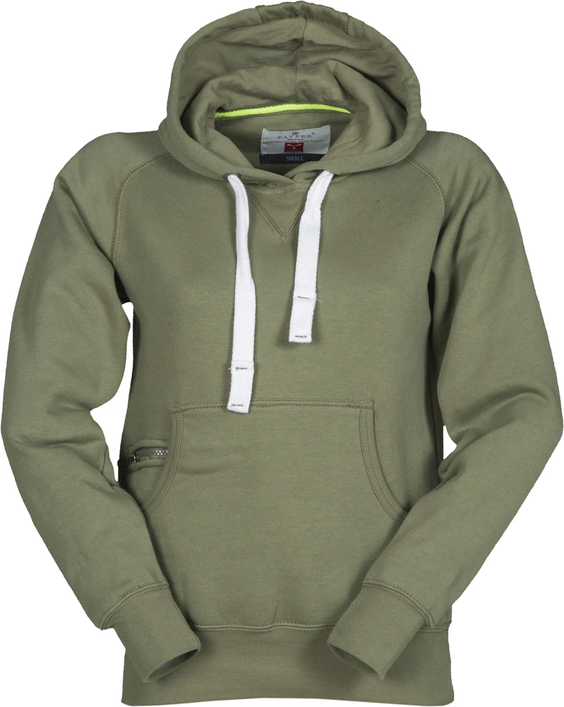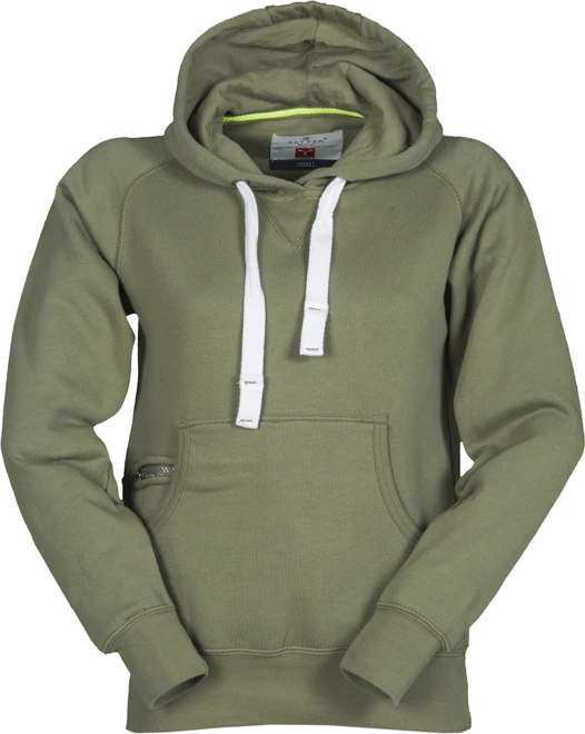 Dvojité švy, kapuce, kovová očka na kapuci, bílá stahovací šňůrka, raglánové rukávy, dekorativní prošití do "V" pod výstřihem, klokaní kapsa, malá kapsa na zip, elastické manžety a spodní lem, vyztužené švy, vypasovaný střih