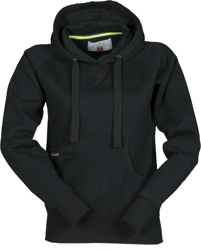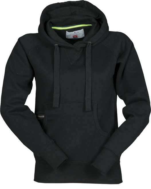 Dvojité švy, kapuce, kovová očka na kapuci, bílá stahovací šňůrka, raglánové rukávy, dekorativní prošití do "V" pod výstřihem, klokaní kapsa, malá kapsa na zip, elastické manžety a spodní lem, vyztužené švy, vypasovaný střih