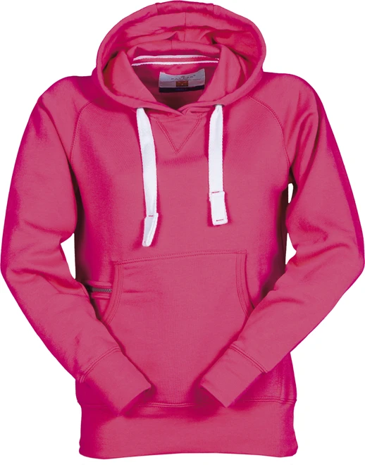 Dvojité švy, kapuce, kovová očka na kapuci, bílá stahovací šňůrka, raglánové rukávy, dekorativní prošití do "V" pod výstřihem, klokaní kapsa, malá kapsa na zip, elastické manžety a spodní lem, vyztužené švy, vypasovaný střih