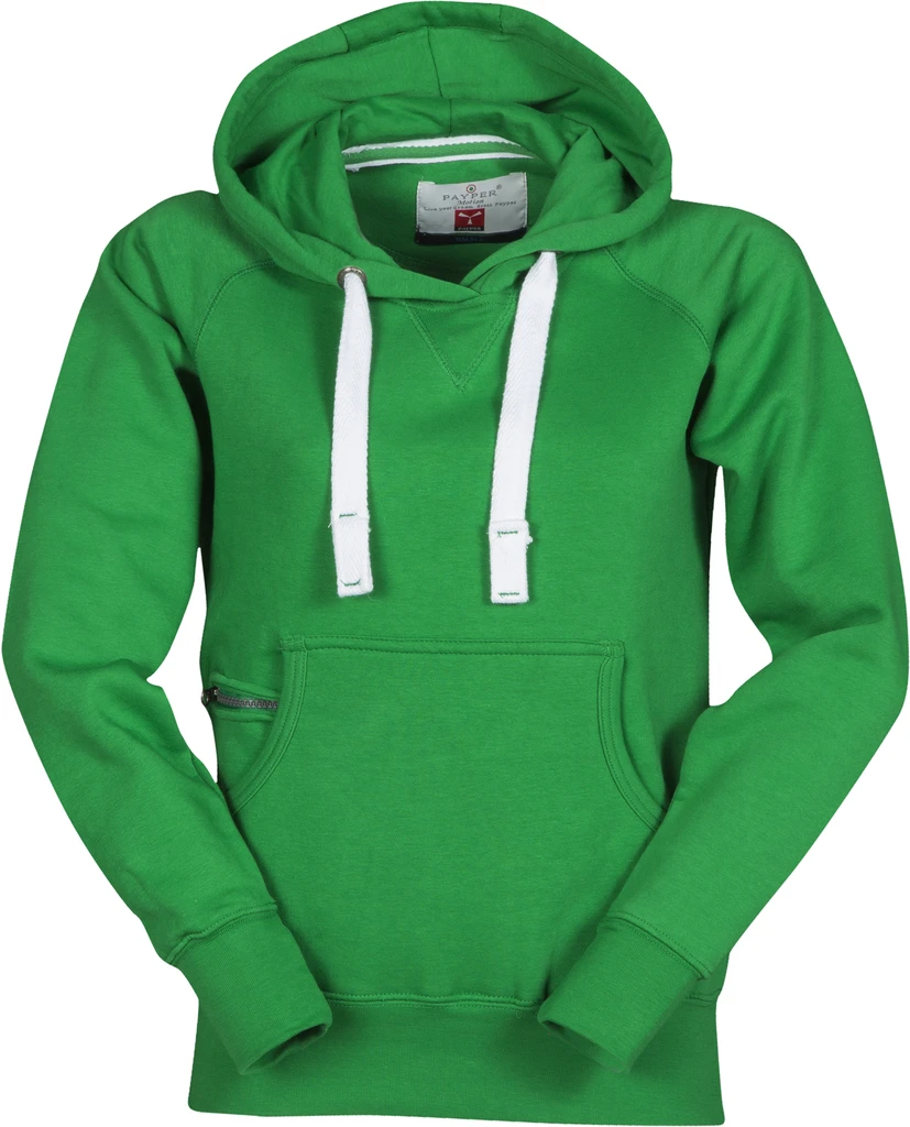 Dvojité švy, kapuce, kovová očka na kapuci, bílá stahovací šňůrka, raglánové rukávy, dekorativní prošití do "V" pod výstřihem, klokaní kapsa, malá kapsa na zip, elastické manžety a spodní lem, vyztužené švy, vypasovaný střih