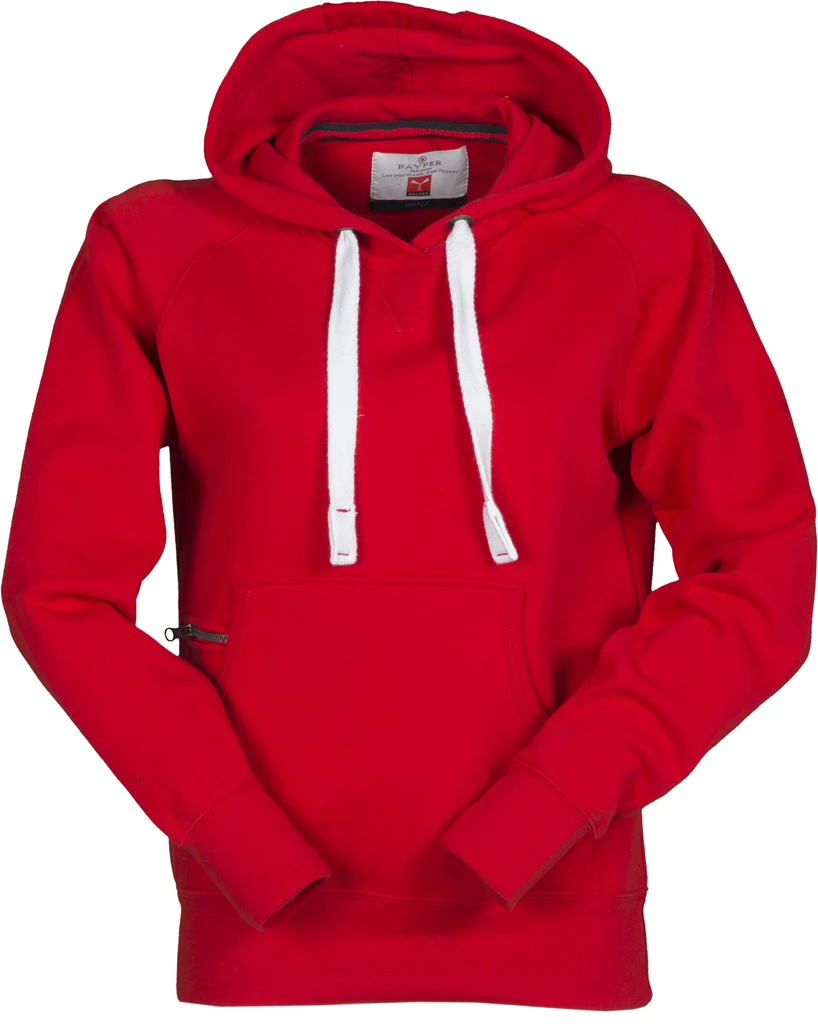 Dvojité švy, kapuce, kovová očka na kapuci, bílá stahovací šňůrka, raglánové rukávy, dekorativní prošití do "V" pod výstřihem, klokaní kapsa, malá kapsa na zip, elastické manžety a spodní lem, vyztužené švy, vypasovaný střih