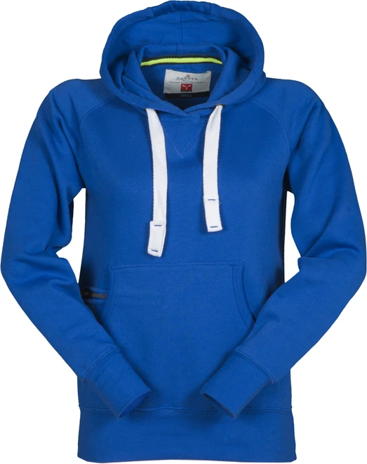 Dvojité švy, kapuce, kovová očka na kapuci, bílá stahovací šňůrka, raglánové rukávy, dekorativní prošití do "V" pod výstřihem, klokaní kapsa, malá kapsa na zip, elastické manžety a spodní lem, vyztužené švy, vypasovaný střih