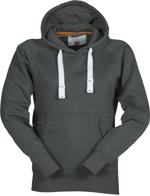 Dvojité švy, kapuce, kovová očka na kapuci, bílá stahovací šňůrka, raglánové rukávy, dekorativní prošití do "V" pod výstřihem, klokaní kapsa, malá kapsa na zip, elastické manžety a spodní lem, vyztužené švy, vypasovaný střih