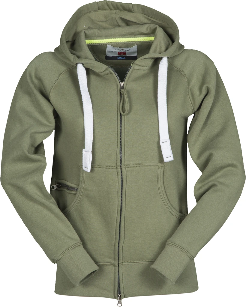 Vypasovaný střih, plastový zip po celé délce, kovový dvojcestný jezdec, kapuce s dvojitým prošitím švů, bílá stahovací šňůrka, kovová očka na kapuci, raglánové rukávy, klokaní kapsa, malá kapsa na zip, elastické manžety a spodní lem, vyztužené švy