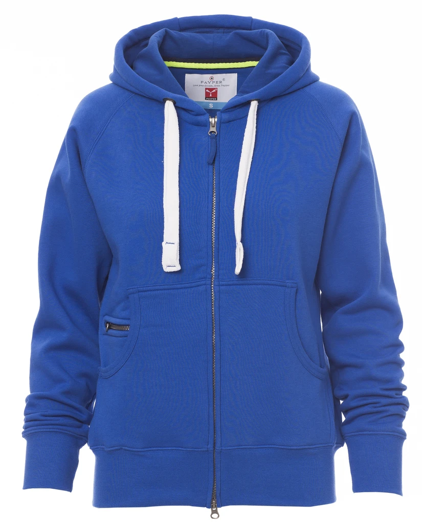 Vypasovaný střih, plastový zip po celé délce, kovový dvojcestný jezdec, kapuce s dvojitým prošitím švů, bílá stahovací šňůrka, kovová očka na kapuci, raglánové rukávy, klokaní kapsa, malá kapsa na zip, elastické manžety a spodní lem, vyztužené švy