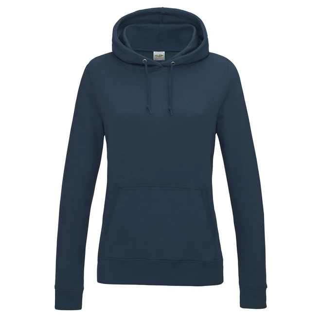 Dvojité prošití detailů, dámský střih, kapuce z dvojité vrstvy látky, šňůrky ve stejné barvě jako mikina, klokaní kapsa se skrytým vývodem na sluchátka, žebrované manžety a spodní lem, jednoduchá změna značky, ideální povrch pro potisk.