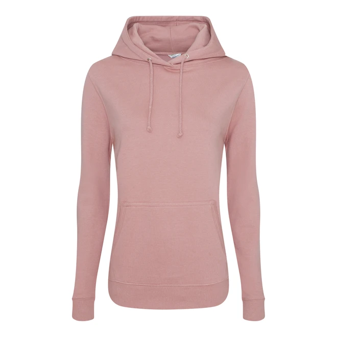 Dvojité prošití detailů, dámský střih, kapuce z dvojité vrstvy látky, šňůrky ve stejné barvě jako mikina, klokaní kapsa se skrytým vývodem na sluchátka, žebrované manžety a spodní lem, jednoduchá změna značky, ideální povrch pro potisk.