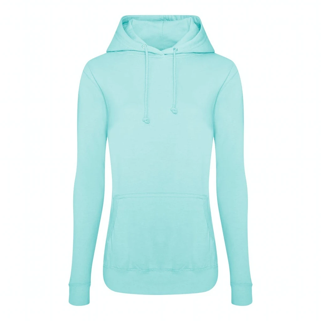 Dvojité prošití detailů, dámský střih, kapuce z dvojité vrstvy látky, šňůrky ve stejné barvě jako mikina, klokaní kapsa se skrytým vývodem na sluchátka, žebrované manžety a spodní lem, jednoduchá změna značky, ideální povrch pro potisk.