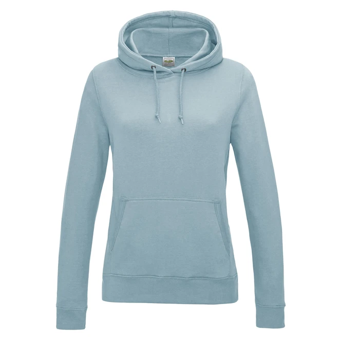 Dvojité prošití detailů, dámský střih, kapuce z dvojité vrstvy látky, šňůrky ve stejné barvě jako mikina, klokaní kapsa se skrytým vývodem na sluchátka, žebrované manžety a spodní lem, jednoduchá změna značky, ideální povrch pro potisk.