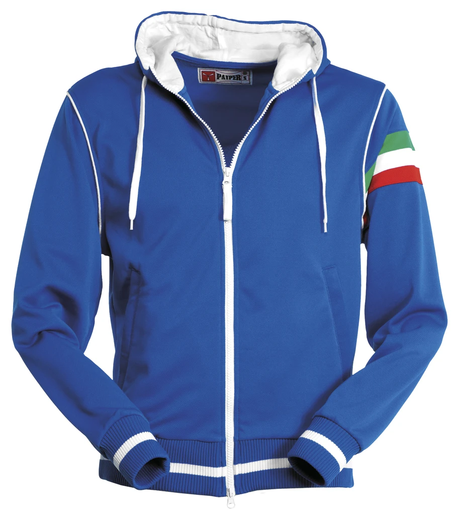 Vypasovaný střih, plastový zip po celé délce, dvojitý kovový jezdec, kontrastní kapuce se stahovací šňůrkou, kontrastní proužek na manžetách a spodním lemu, na levém rukávu pruhy v barvách italské vlajky, 2 kapsy na zip, vyztužené švy