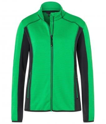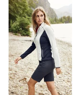Příjemně měkká bi-elastická snadno udržovatelná tkanina, jemný pruhovaný vzhled, po celé délce skrytý zip s ochranou brady, stojací límec, kontrastní vložky, ploché švy, 2 boční kapsy na zip, YKK zipy, lehce vypasovaný střih.