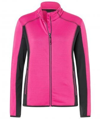 Příjemně měkká bi-elastická snadno udržovatelná tkanina, jemný pruhovaný vzhled, po celé délce skrytý zip s ochranou brady, stojací límec, kontrastní vložky, ploché švy, 2 boční kapsy na zip, YKK zipy, lehce vypasovaný střih.
