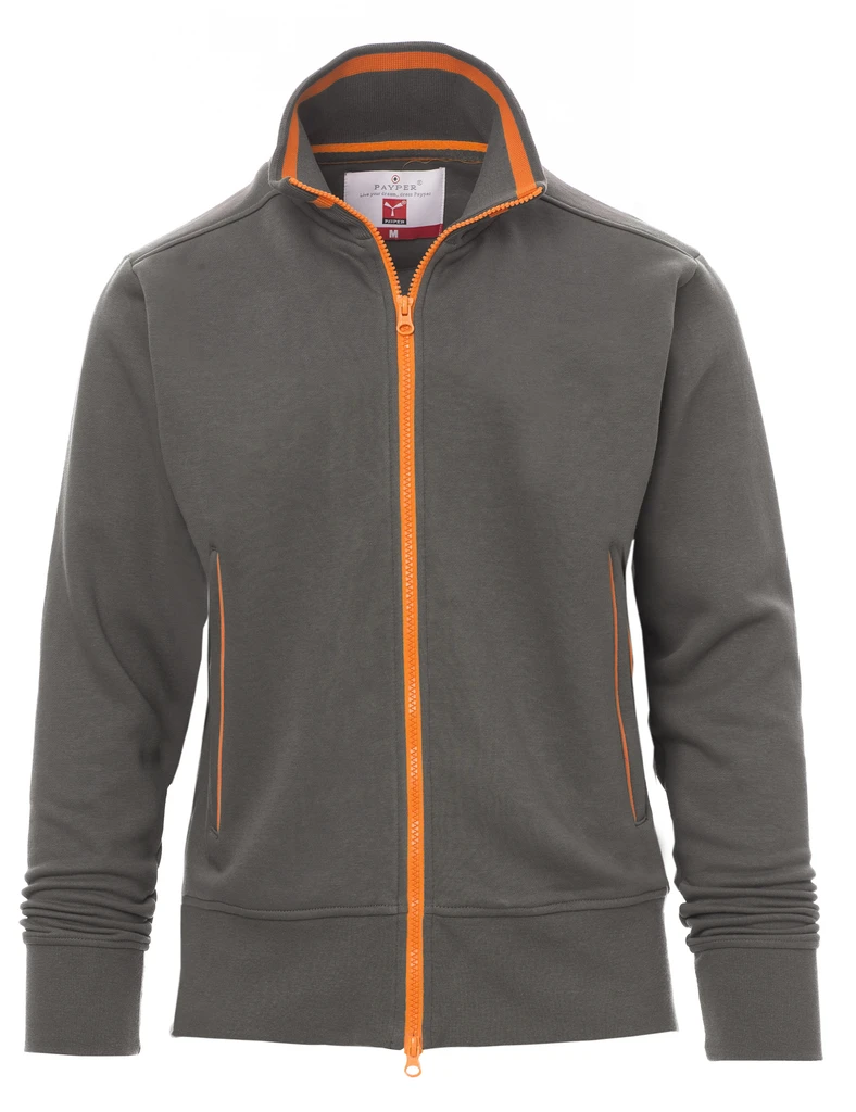 Plastový zip po celé délce, dvojcestný kovový jezdec, žebrovaný límec s kontrastním pruhem, 2 boční kapsy s kontrastním pruhem, vypasovaný střih, elastické manžety a spodní lem, vyztužené švy