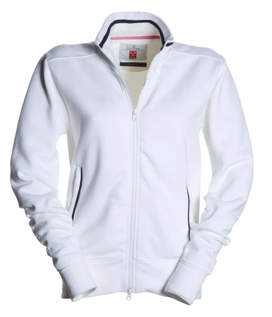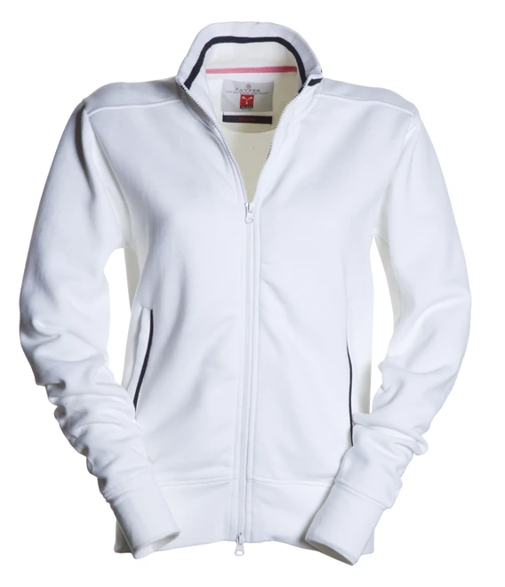 Plastový zip po celé délce, dvojcestný kovový jezdec, žebrovaný límec s kontrastním pruhem, 2 boční kapsy s kontrastním pruhem, vypasovaný střih, elastické manžety a spodní lem, vyztužené švy