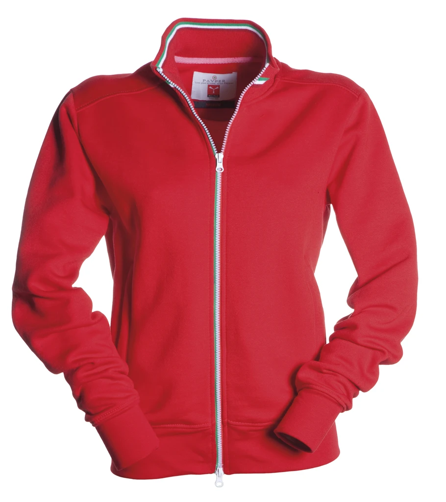 Vypasovaný střih, plastový zip po celé délce - v barvách italské vlajky, dvojitý jezdec, žebrovaný límec s kontrastním proužkem, vsazené rukávy, 2 kapsy, elastické manžety a spodní lem, vyztužené švy