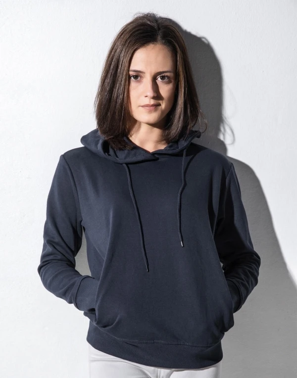 French Terry, vrstvená kapuce se šňůrkou, boční kapsy s žebrovanou klopou, postranní švy, široké žebrovaní na koncích rukávu a spodním lemu, snadná změna značky.